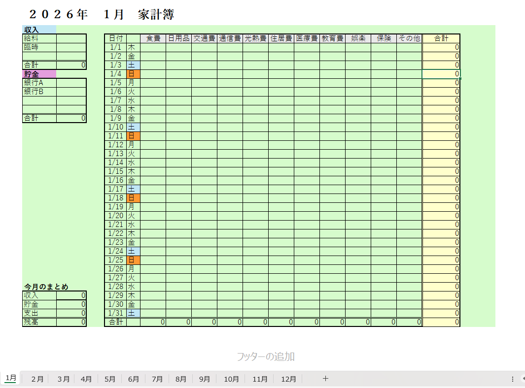 収入・支出・貯蓄をまとめて管理できる、初心者向けのシンプルなExcel家計簿です。